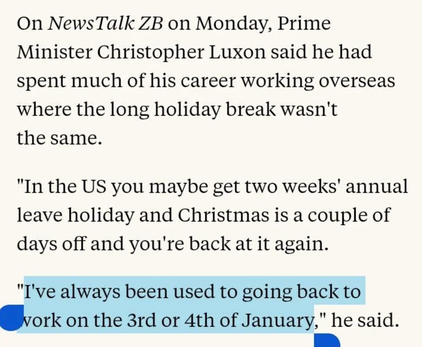 This past December, Christopher Luxon hinted there is an issue with the “long” Kiwi holidays and said we’d do better without them as a country.