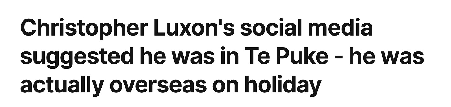 It’s not like I miss Luxon, and he does have 7 social media staff - partially taxpayer funded - to help him out (for example in pretending he’s in Te Puke when he’s overseas or that he’s at work), but let the man live his word for once.